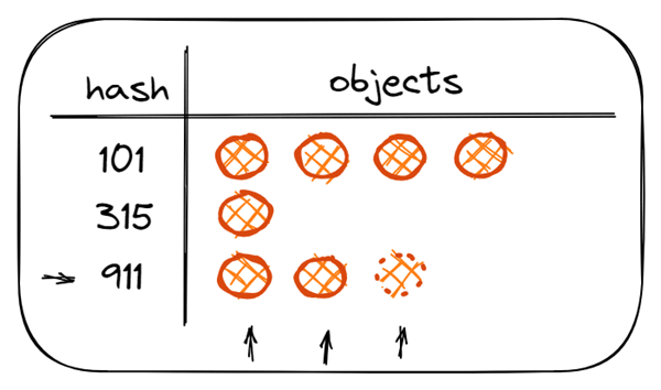 上图中,有 4个对象计算出相同的 hash 码 101,它们被分到同一块区域,它们实际上组成了一个链表,取出 101 对应的对象,需要的时间复杂度为 O(n)。哈希码 315 只对应一个对象,这意味着取出 315 对应的对象,需要的时间复杂度为 O(1)。
